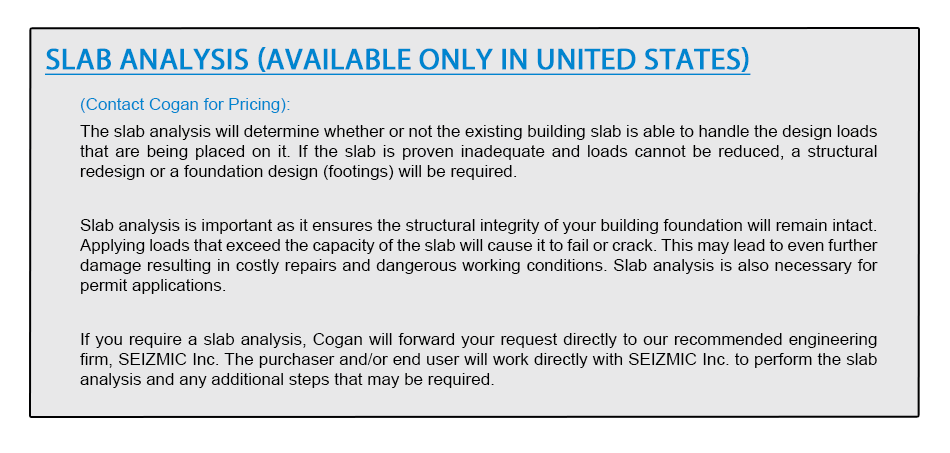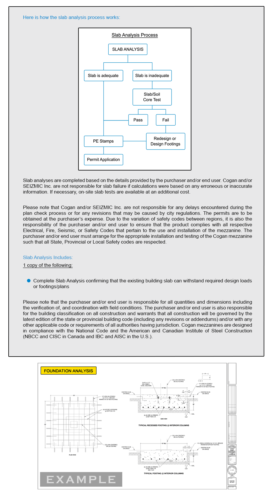 Depending on the complexity of your project and requirements, Cogan recommends that most clients and/or end users work in association with an architect for additional support. This is to ensure that any critical aspects such as building classification and occupancy, electricity, plumbing, fire codes, exit signage etc. will be properly analyzed and addressed. Please keep in mind that Cogan is not responsible for certifying or analyzing the concrete slab capacity and integrity where the mezzanine columns are to be installed.