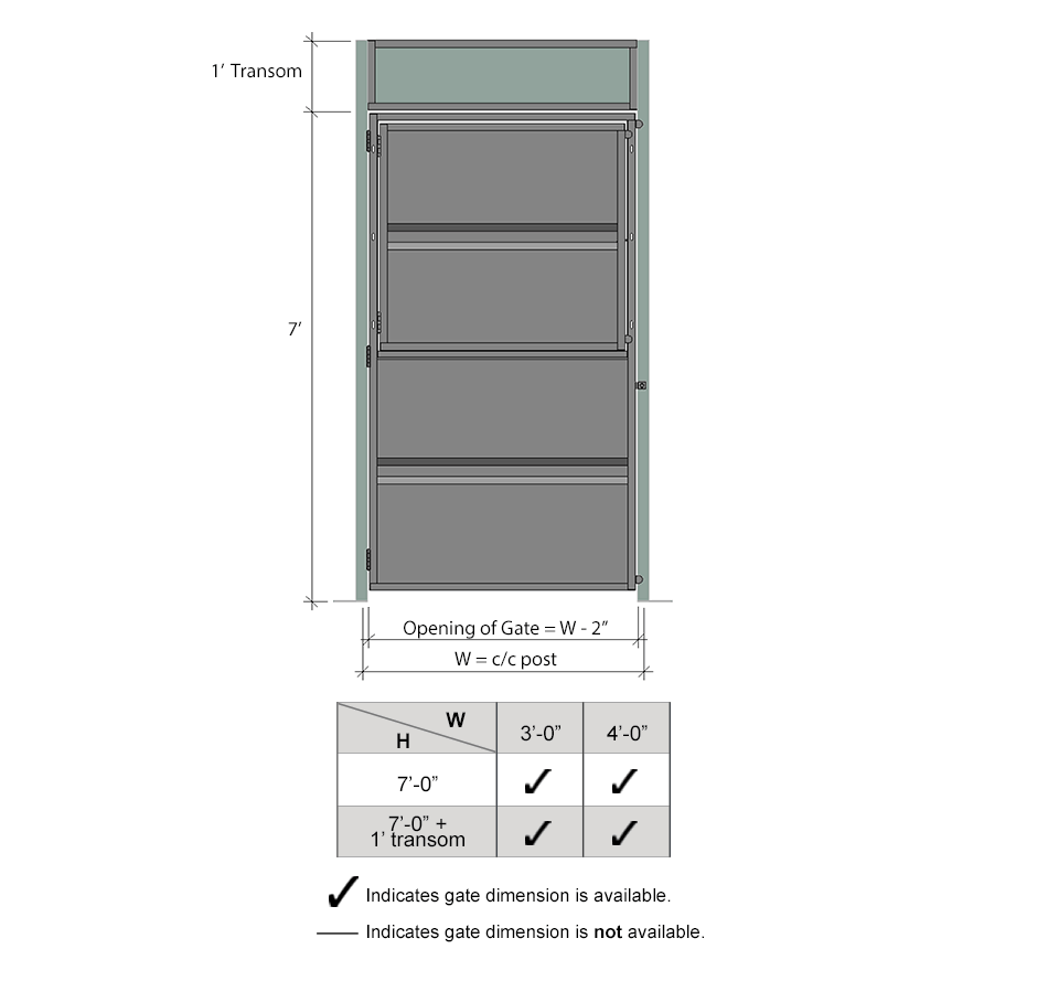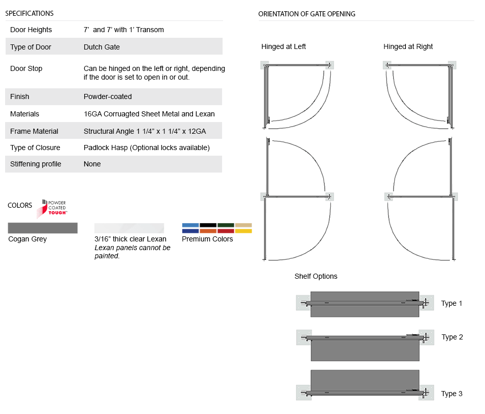 Cogan's Dutch gate is designed to act as both a swing gate and a service counter. Open the top and bottom portions for full-access or open only the top portion to create a service wicket. Installs in two orientations. Padlock hasp and hinges as well as a spring latch are included. Additional lock options are also available. The optional transom panel is made of 3/16" thick clear Lexan and the doors are made of heavy-duty 16 GA corrugated steel framed in 1 1/4" x 1 1/4" x 12 GA structural angle.
