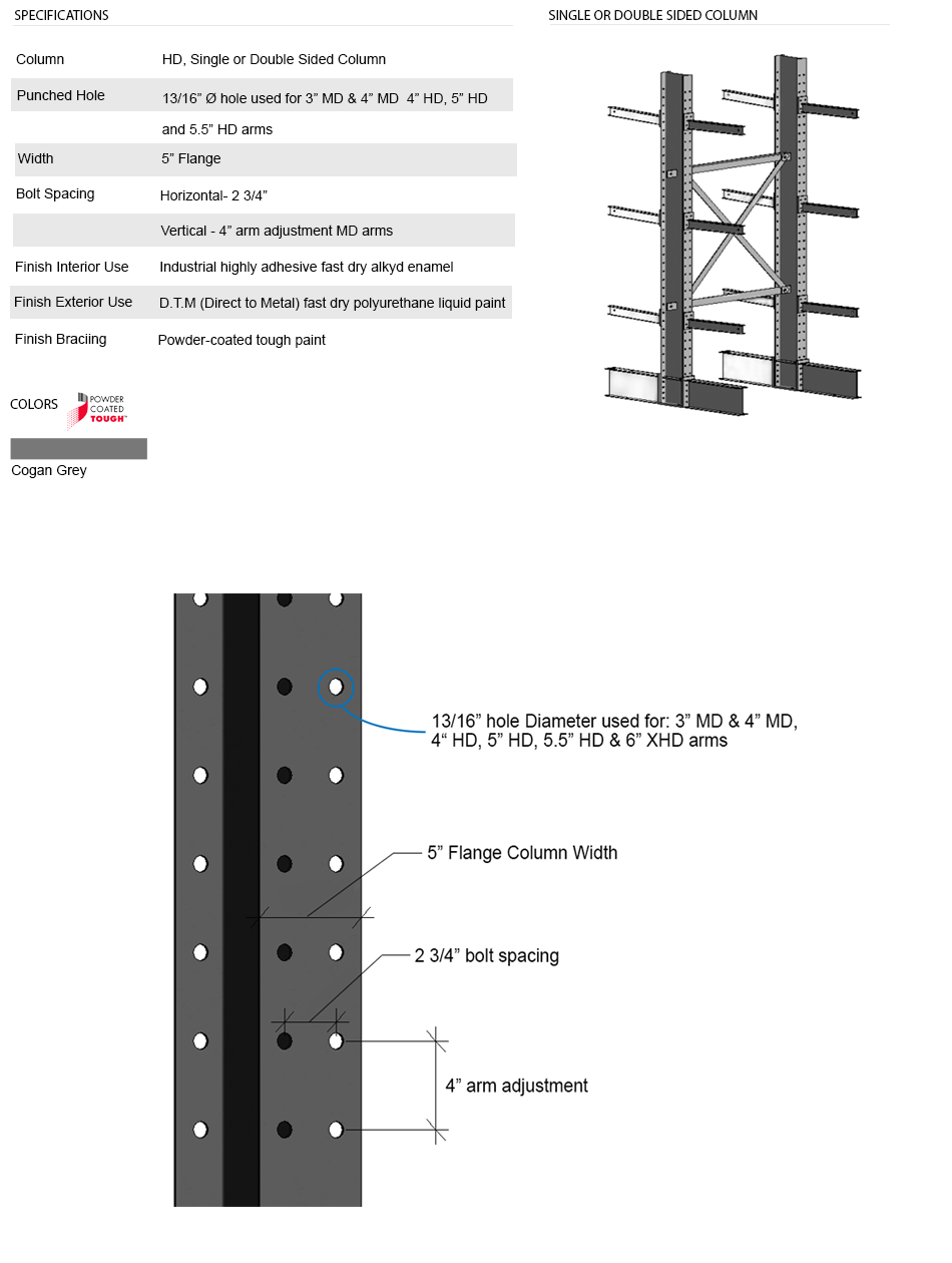 The rack columns are a major component of the cantilever system. They are categorized into two types: LD Columns and HD Columns depending on the width. Rack columns are the vertical structural elements that support the rack arms and roof arms and transfer gravity loads to the rack base and anchoring slab. It is very important to note that the column type is determined by a Cogan engineer based on the quantity of arms and the maximum load capacity per arm. It is essential to refer to the assigned Cogan quote or Cogan Approval Drawings for detailed column and storing material.