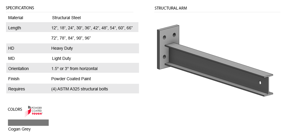 Structural arms are available in various lengths, which include 12”, 18”, 24”, 30”, 36”, 42”, 48”, 54”, 60”, 72”, 78”, 84”, 90”, and 96”. The arm plate connection is identified as 3”MD, 4” MD, 4”HD, 5” HD, 5.5” HD, and 6” XHD, which indicates the spacing between each punched bolt hole. The plates are either 1\2” thick or 5\8” thick and have four ø13/16” or ø 1/2” punched holes at each corner. The plate requires 4-ASTM A325 structural bolts specified and tested for this specific purpose. These bolted connections fix the arm to the rack column on one end, leaving it free on the opposing end, thus resulting in a cantilever rack arm. The arms are designed to resist uniformly distributed loads exerted by the product that is supported and shall be manufactured of structural S-sections, W-sections or equivalent structural profiles. The supported load should be centered on the arm and should refrain from exceeding the edge of the arm. The arms are used for interior and exterior purposes. For all applications, the arms are finished with a powder-coated Cogan standard grey paint, which provides ultra-resilient protection.